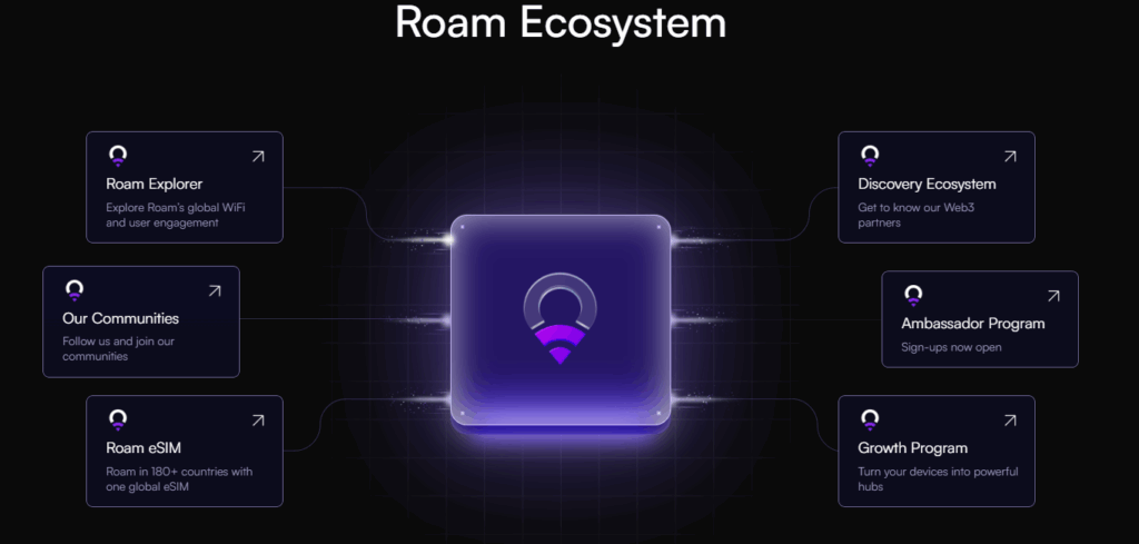 Ekosistemin temel parçaları arasında Roam Explorer arayüzü, küresel eSIM hizmeti, Web3 ortaklık alanı olan Discovery Ecosystem, topluluk odaklı Ambassador Program, cihaz temelli büyümeyi hızlandıran Growth Program ve geniş sosyal topluluk ağları yer alır. Bu yapı, hem kullanıcılar hem de geliştiriciler için kapsamlı, ölçeklenebilir ve açık bir bağlantı ekosistemi oluşturur.