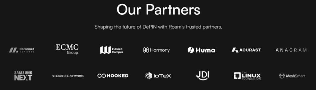 Teknoloji tarafında The Linux Foundation, IoTeX ve Harmony gibi önemli altyapı ortakları öne çıkar. Ayrıca Huma, Hooked, Acurast, MeshSmart, JDI ve JSending.Network gibi Web3 projeleriyle yapılan entegrasyonlar Roam’ın cihaz ekosistemini, veri altyapısını ve zincirler arası uyumluluğunu güçlendirir.