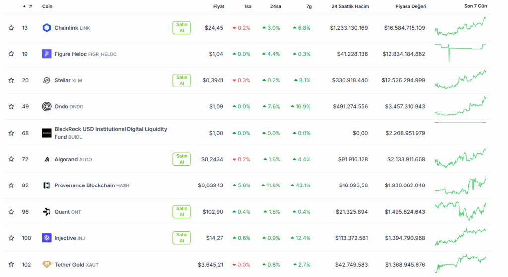 Güncel RWA (Real World Asset) coinleri arasında öne çıkanlar LINK (Chainlink), FIGR_HELOC (Figure Heloc), XLM (Stellar), ONDO (Ondo), ALGO (Algorand) ve XAUT (Tether Gold) gibi tokenlardır. LINK, akıllı kontratların gerçek dünya verilerine güvenli bir şekilde bağlanmasını sağlayan bir oracle ağı olarak dikkat çekerken, FIGR_HELOC ev kredilerini tokenize ederek DeFi ekosistemine entegre ediyor. XLM, hızlı ve düşük maliyetli sınır ötesi ödemeler için kullanılırken, ONDO tokenize edilmiş hisse senetleri ve tahviller üzerinden yatırım fırsatları sunuyor. ALGO, Algorand blockchain’in yerel tokeni olarak yüksek performanslı ve ölçeklenebilir bir altyapı sağlarken, XAUT ise altın gibi değerli metaları temsil eden tokenize bir varlık olarak yatırımcıların portföylerine dahil ediliyor.