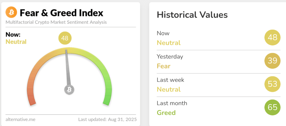 Bitcoin’in 14 Ağustos’ta ulaştığı 124.128 dolarlık zirvenin ardından, yayın tarihi itibarıyla fiyat 108.748 dolarda işlem görüyor. Son yedi gün içinde toplam piyasa değeri %6,18 düşerek 3,79 trilyon dolara geriledi. Öte yandan, Kripto Korku ve Açgözlülük Endeksi, 39’dan 48’e yükselerek piyasa duyarlılığında toparlanma sinyali verdi. Bu gelişmeler, yatırımcıların kısa vadeli duygusal tepkilerini yansıtıyor.
