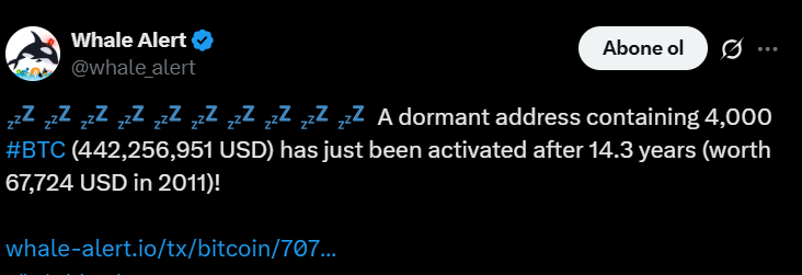 Memepool verileri, bu cüzdanın geçmişte 7.850 BTC tutabileceğini gösteriyor. Balina, en son Haziran 2011’de aktif olmuş ve tüm Bitcoin’lerini tek bir adreste toplamıştı. Güncel BTC fiyatı 110.604 dolar civarında işlem görürken, balinanın toplam varlıklarının değeri 442 milyon doların üzerinde.