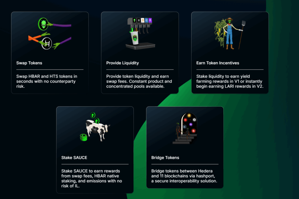 SaucerSwap, Hedera ağının en aktif DeFi merkezidir. Üzerinde geliştirilen uygulamalar arasında: