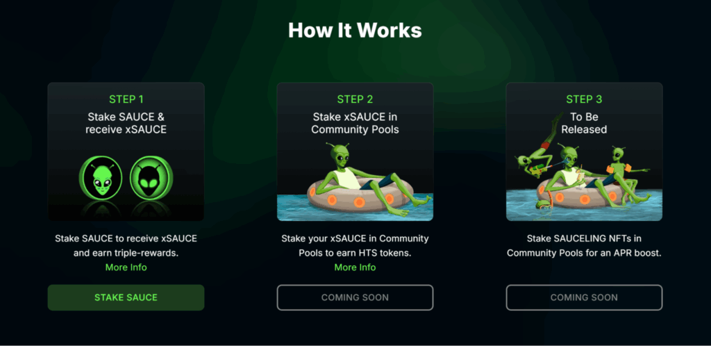 Kullanıcılar SAUCE tokenlerini stake ederek xSAUCE kazanır ve takas ücretlerinden, HBAR staking ödüllerinden ve SAUCE emisyonlarından oluşan “üçlü ödül” mekanizmasından faydalanır.