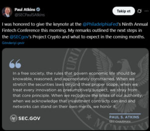 Atkins’in bu yaklaşımı, kripto sektöründe belirsizliğe neden olan “her şey menkul kıymet” bakış açısını yumuşatıyor.