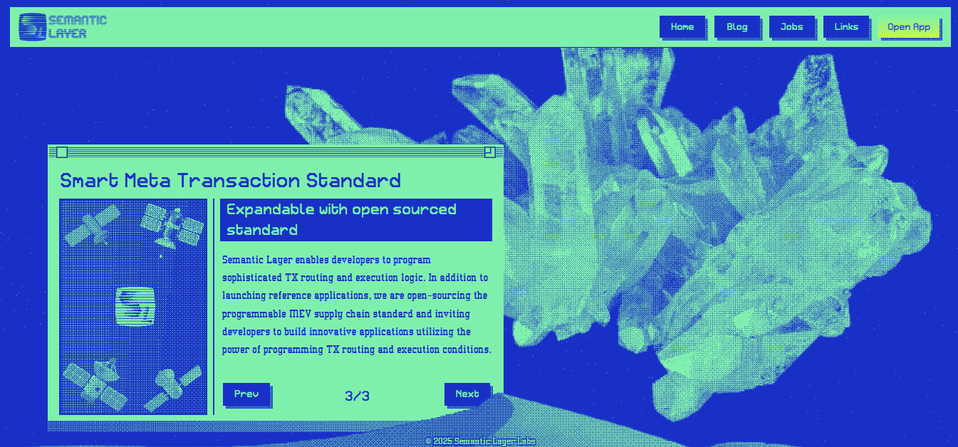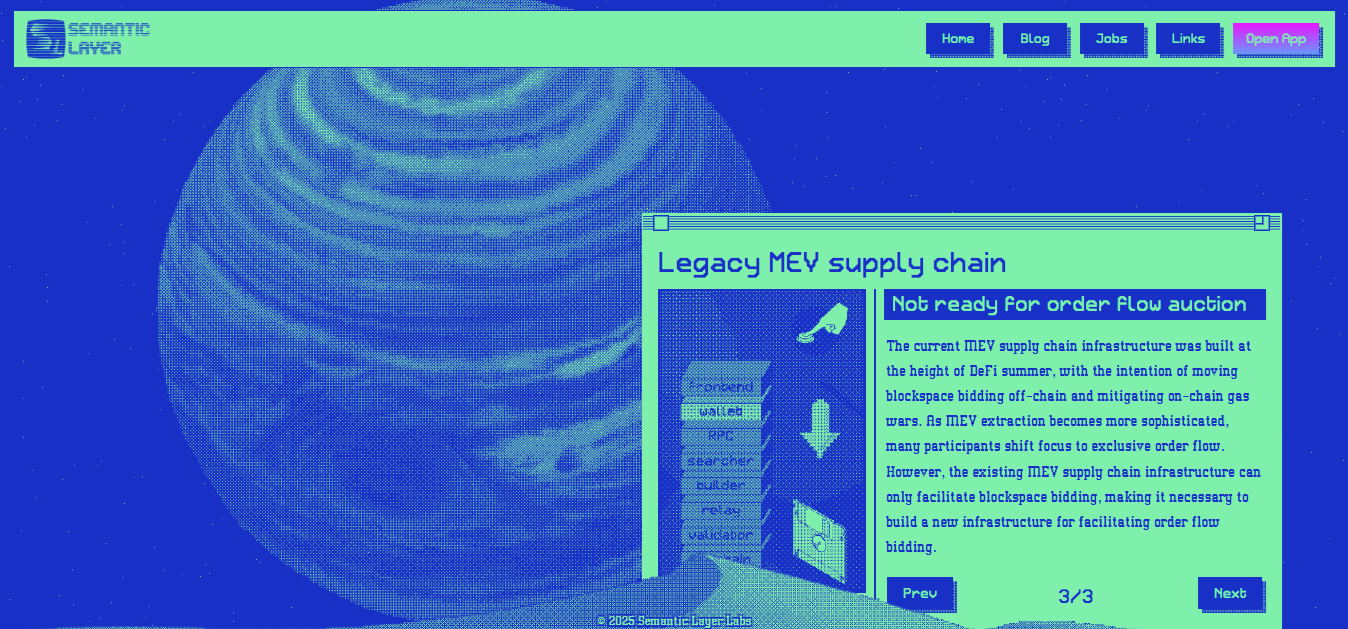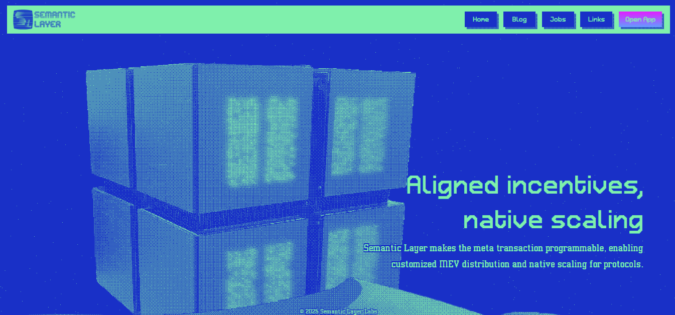 Semantic Layer, dApp’ler için programlanabilir bir MEV tedarik zinciri sunan bir altyapı protokolüdür. Application-Controlled Execution (ACE) ile dApp’ler, MEV’yi içselleştirir, işlem akışını (order flow) kontrol eder ve özel yürütme mantığı uygular. Bu sayede protokoller kendi gelir modellerini oluşturabilir, kullanıcılara daha adil MEV dağıtımı sağlayabilir ve zincir üstü güvenlik mekanizmalarını güçlendirebilir. Semantic Layer, mevcut MEV tedarik zincirinin aksine, kullanıcıların ve geliştiricilerin çıkarlarını ön planda tutar.