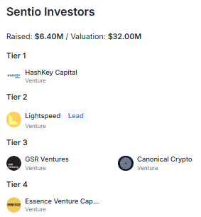 Sentio, bugüne kadar 6,4 milyon dolar fon toplamış ve 32 milyon dolar değerlemeye ulaşmıştır. Yatırımcıları farklı katmanlarda şöyle sıralanabilir: