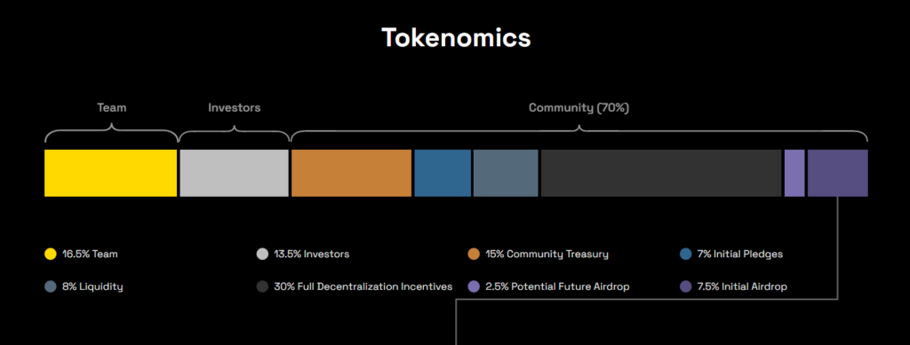 - Decentralization odaklı: %30 token decentralization incentives + %70 community tahsisi