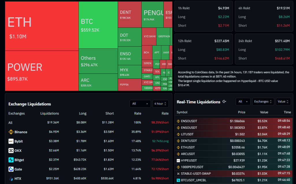 Aslında piyasada iyileşen yatırımcı duyarlılığı, düşüş yönlü (bearish) pozisyonlarda bulunan trader’lar üzerinde ciddi bir baskı oluşturdu. CoinGlass verilerine göre son 24 saatte 131 binden fazla trader tasfiye oldu ve toplam likidasyon miktarı 571 milyon doları geçti. Bunun yaklaşık 468,6 milyon dolarlık kısmı short pozisyonlardan kaynaklandı.