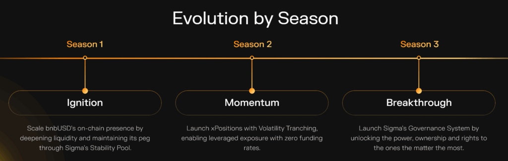 Sezon 3: Breakthrough, topluluk odaklı merkeziyetsiz yönetişim sistemini başlatmayı ve SIGMA token sahiplerinin protokol yönetimine katılımını sağlamayı hedefliyor. Gelecekte xPOSITION genişletmesi, short pozisyonlar, NFT entegrasyonları, farming güncellemeleri ve RWA+AI entegrasyonları ile BNB Chain üzerinde DeFi yenilikleri sürdürülecek. Ayrıca bnbUSD genişletilmiş stablecoin kullanımı, yeni tranching modellerinin testnet yayını, topluluk yönetişim oylamaları ve çok zincirli entegrasyonlar (Ethereum & Arbitrum) planlanıyor. Maksimum arz 1 milyar SIGMA token ile sınırlı olacak.
