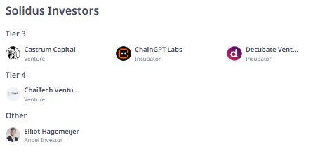 Solidus AI Tech, Castrum Capital, ChainGPT Labs, Decubate Ventures, ChaiTech Ventures ve Elliot Hagemeijer gibi yatırımcılarla desteklenmektedir.