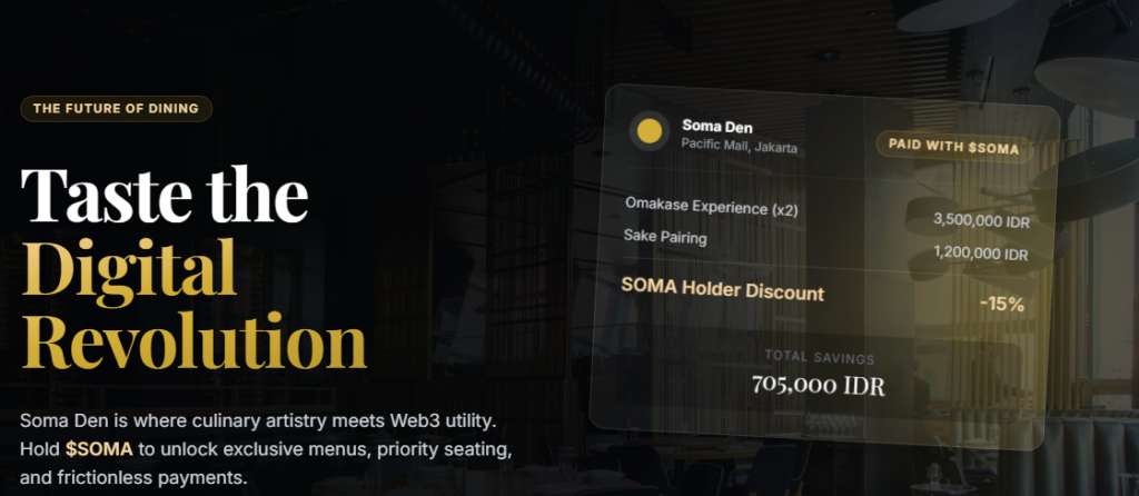 Soma Den, restoran deneyimini Web3 altyapısıyla birleştirmeyi hedefleyen yeni nesil bir gastronomi ve sadakat ekosistemidir. Projenin merkezinde yer alan SOMA ($SOMA), Soma Den restoranlarında kullanılmak üzere tasarlanmış, gerçek dünya kullanımına sahip bir utility tokendir.