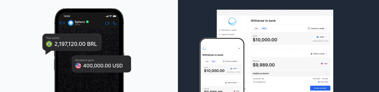 • Gömülü Ramp: 20 satır JavaScript ile kullanıcıların fiat para birimleri üzerinden stablecoin almasını veya satmasını sağlar; KYC, fiat ray’leri ve uyumluluk Sphere tarafından yönetilir.