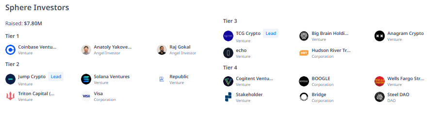 Sphere, 7,8 milyon dolar yatırım toplamıştır ve şu yatırımcılar tarafından desteklenmektedir: