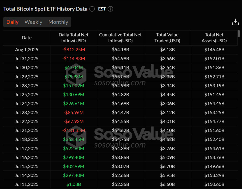 Spot Bitcoin ETF’leri, Cuma günü 812,25 milyon dolarlık net çıkışla tarihindeki en büyük ikinci kaybı kaydetti. Bu büyük çıkış, bir haftalık net giriş sürecini sonlandırdı. SoSoValue verilerine göre, Bitcoin ETF’lerinin toplam net girişi 54,18 milyar dolara geriledi.