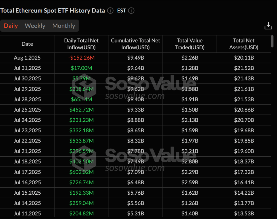 Ether ETF’leri Giriş Serisini Bitirdi: 152 Milyon Dolarlık Çıkış