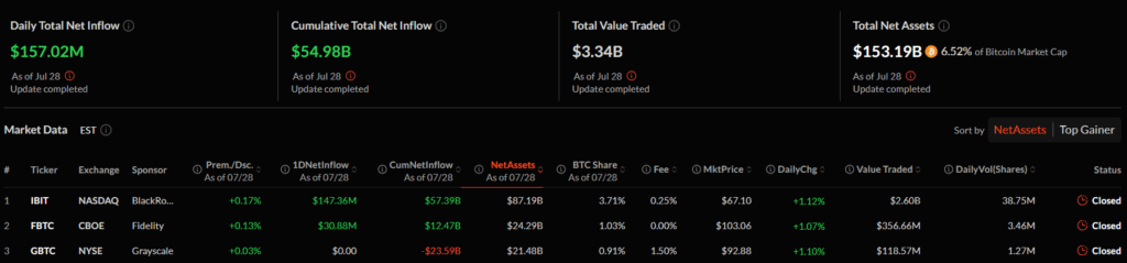 Spot Bitcoin ETF’leri, 28 Temmuz tarihinde toplamda 157 milyon dolarlık net giriş kaydetti. Bu artış, üst üste üçüncü gün pozitif net giriş sağlanması anlamına geliyor.
