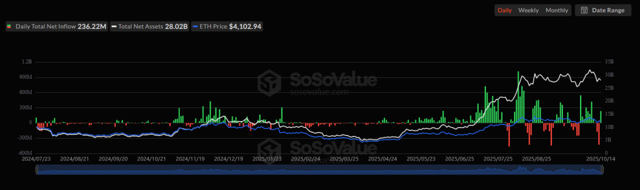Yalnızca Bitcoin değil, Ethereum ETF’leri de yatırımcı ilgisinin arttığı bir dönemden geçiyor. Spot Ethereum ETF’leri 14 Ekim’de toplam 236,22 milyon dolarlık net giriş kaydederken, dikkat çekici şekilde dokuz ETF’nin hiçbirinde net çıkış görülmedi.