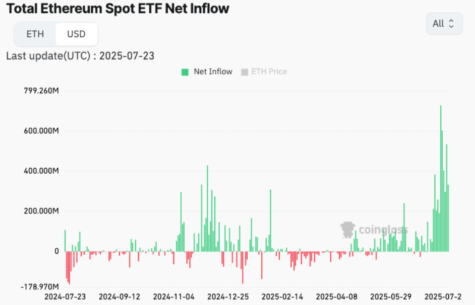 Ayrıca 23 Temmuz 2025 itibarıyla, Bitcoin ETF’lerinden 83 milyon dolar çıkış yaşanırken, Ethereum ETF’lerine 332,2 milyon dolar giriş oldu. Üstelik bu trend sadece bir başlangıç olabilir. Yatırımcılar artık Ether ETF’lerine sadece fiyat hareketiyle değil, pasif kazanç potansiyeliyle de bakıyor.