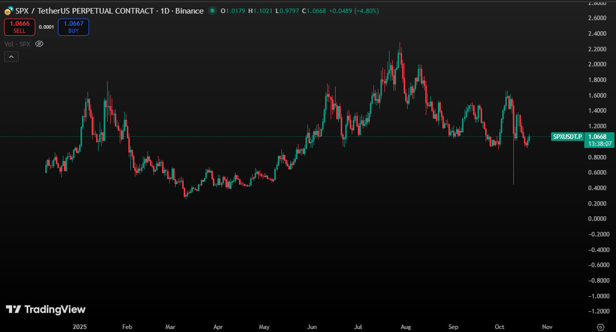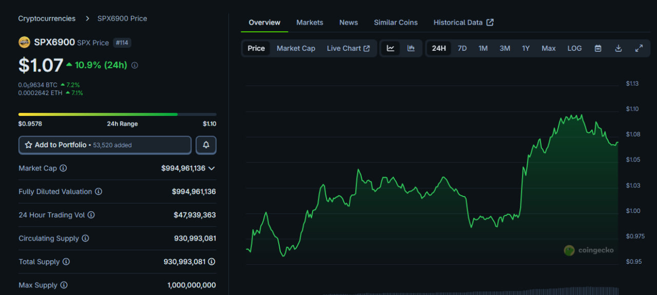 SPX, memecoin piyasasında pozitif ayrıştı! 1,07 dolara ulaşan fiyatı ve artan işlem hacmiyle yatırımcı ilgisini yeniden kazandı. SPX6900 (SPX), son 24 saatte %15,71’lik yükselişle kripto piyasasının öne çıkan tokenlerinden biri oldu. Güncel fiyatı 1,07 dolar seviyesinde bulunuyor.