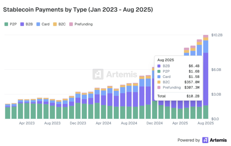 Artemis’in verilerine göre, stablecoin ödeme hacimleri Şubat ayındaki 6 milyar dolardan Ağustos 2025’te 10 milyar doların üzerine çıktı. Bu yükseliş, zincir içi varlıkların artık sadece DeFi ekosistemiyle sınırlı kalmadığını, gerçek dünya ödemelerinde de aktif rol oynadığını kanıtlıyor.