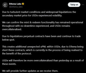 Olayın ardından Ethena ekibi bir açıklama yayınlayarak kullanıcıları sakinleştirmeye çalıştı. Protokol, piyasalardaki ani hareketlenmeler ve yaygın likidasyonlar nedeniyle USDE’nin ikincil piyasalarda kısa süreli volatilite yaşadığını belirtti.