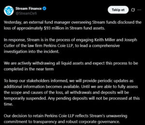 DeFi sektöründe önemli bir konuma sahip olan Stream Finance, varlıklarını yöneten harici bir fon yöneticisinin yaklaşık 93 milyon dolarlık zarar bildirmesinin ardından para yatırma ve çekme işlemlerini tamamen durdurduğunu açıkladı. Şirket, kullanıcı fonlarının güvenliğini sağlamak ve olayın nedenlerini tespit etmek için uluslararası hukuk firması Perkins Coie LLP ile iş birliği başlattı.