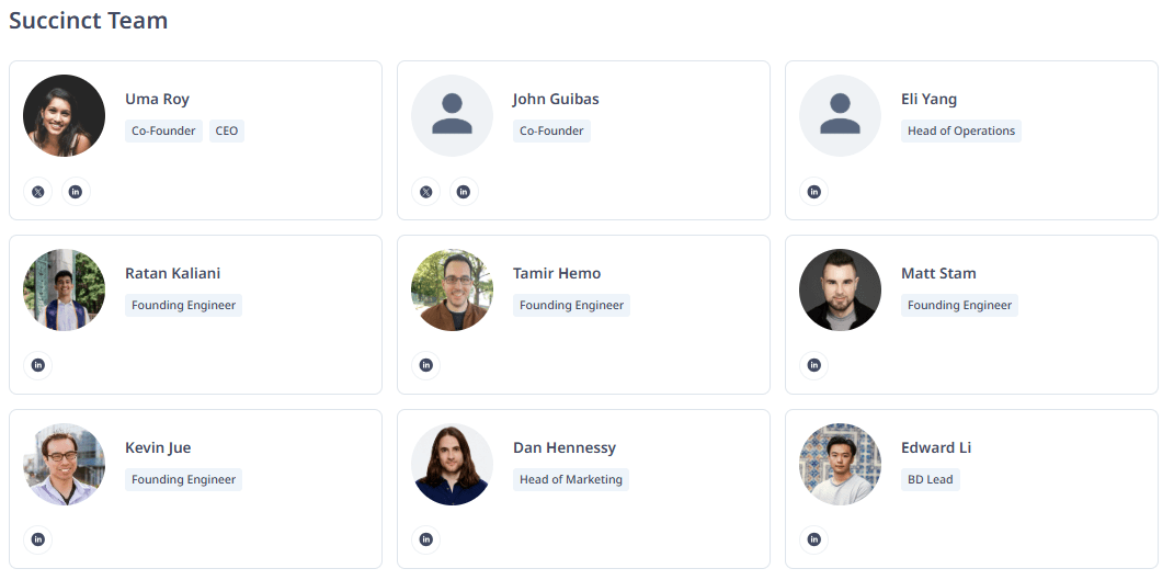 Succinct’in başında, CEO ve kurucu ortak Uma Roy ile kurucu ortak John Guibas bulunuyor. Ekip, Eli Yang (Operasyon Müdürü), Ratan Kaliani, Tamir Hemo, Matt Stam, Kevin Jue (Kurucu Mühendisler), Dan Hennessy (Pazarlama Müdürü) ve Edward Li (İş Geliştirme Lideri) gibi deneyimli isimlerden oluşuyor. Ekip, blockchain ve teknoloji alanındaki uzmanlıklarıyla Succinct’i yenilikçi bir platform haline getiriyor.
