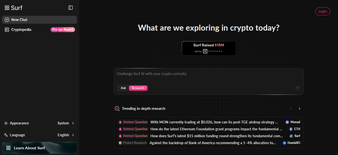 Surf, dijital varlık alanında ihtiyaç duyulan derin veri analizini yapay zeka ile birleştiren yenilikçi bir değerlendirme platformudur. Kullanıcılar, karmaşık piyasa verilerine ulaşmak için grafik ya da tablo arasında kaybolmak yerine, Surf’ün sohbet tabanlı arayüzü sayesinde net ve güvenilir bilgilere anında erişebilir.