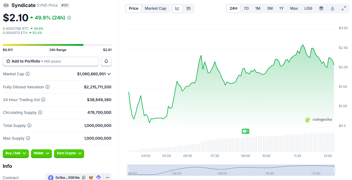 SYND, piyasaya sürüldüğü günden bu yana güçlü bir ivme yakaladı. Coin sıralamasında şu anda 121. sırada yer alıyor. Güncel fiyat 2,10 dolar seviyesinde ve token son 24 saatte %49,9 oranında değer kazandı. Bu performans, yatırımcı ilgisinin artarak devam ettiğini ve kısa vadede güçlü bir talep oluştuğunu gösteriyor.