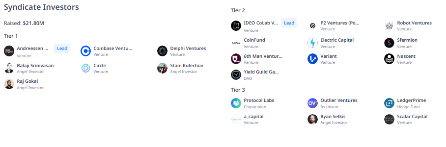 - Tier 3: Protocol Labs, Outlier Ventures, LedgerPrime, a_capital, Scalar Capital, Sound Ventures, OpenSea, Global Coin Research, BlueYard Capital, True Ventures, Kleiner Perkins, Uniswap Labs Ventures, Ryan Sean Adams, FalconX, CoinList, Tyler Ward, 35Ventures, Weekend Fund, Aave.