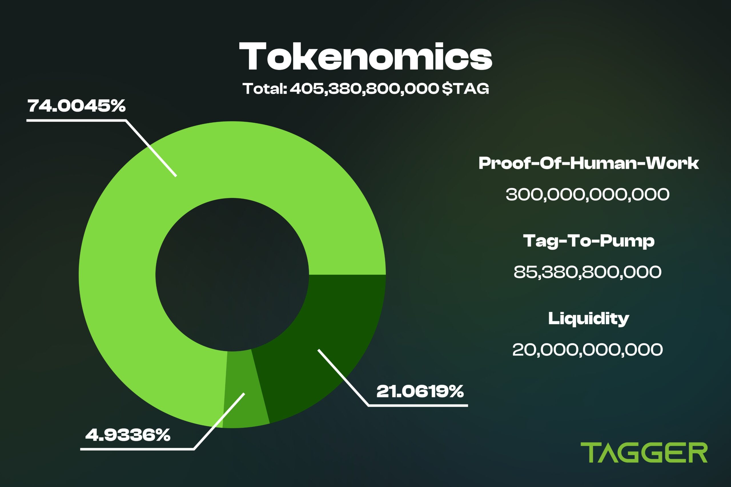 Tagger platformunun yerel token’ı $TAG, hem yönetişim aracı hem de sistemin temel para birimi olarak görev yapıyor. Toplam arzı 405.380.800.000 adet olan $TAG, doğrudan katılımcı emeğiyle üretiliyor.