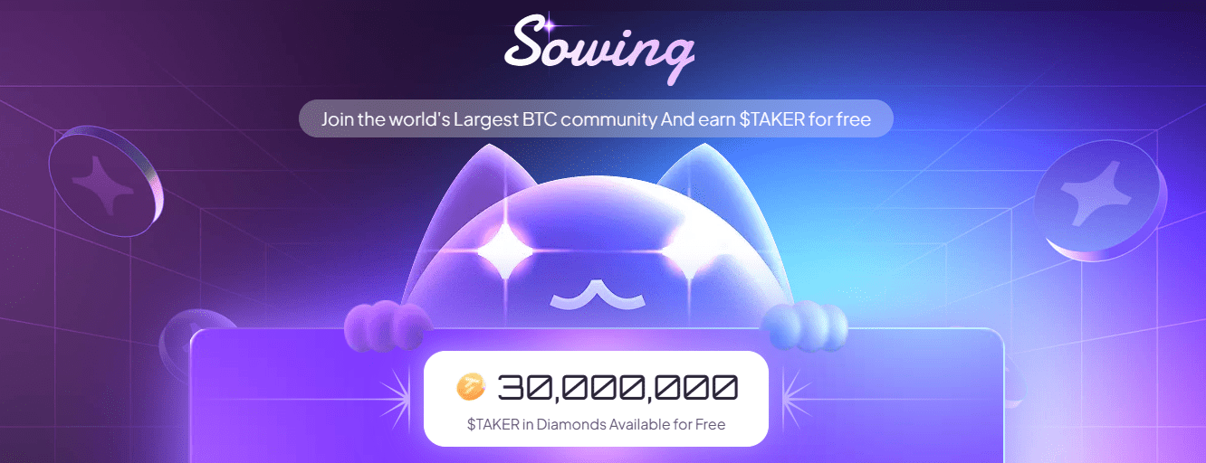 Taker Sowing, Taker’ın kullanıcı kazanım motorudur ve şimdiden 5 milyondan fazla kullanıcıyı çekmiştir. Sıfır giriş bariyeriyle tasarlanan bu sistem, kullanıcıları Bitcoin ekosistemine yönlendirmek için görev tabanlı bir teşvik modeli kullanır. Özellikleri: