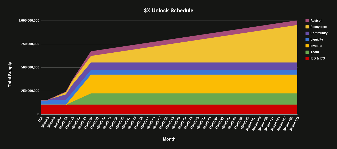 - TGE + 3 Ay: Ekosistem ve topluluk tokenları, sırasıyla 120 ve 12 ay boyunca doğrusal olarak dağıtılır.