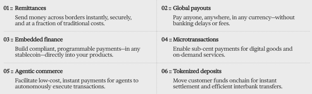 Gömülü finans: Stablecoin uyumlu, programlanabilir ödemeleri doğrudan ürünlerinize entegre edin.