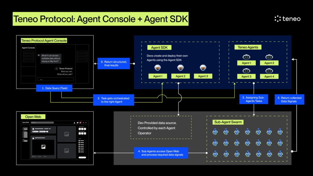 Neden Önemli? Veri, iş kararlarından AI eğitimine kadar her şeyi besler ama çoğu kurumsal silolarda kilitli veya çok pahalıdır. Teneo ile bireyler “veri üreticisi” olmaktan çıkıp “veri katkıda bulunan ve kazanan” hale gelir. Sub-Agent’lar swarm (sürü) oluşturarak veriyi yapılandırır ve Agent Console üzerinden erişilebilir kılar.