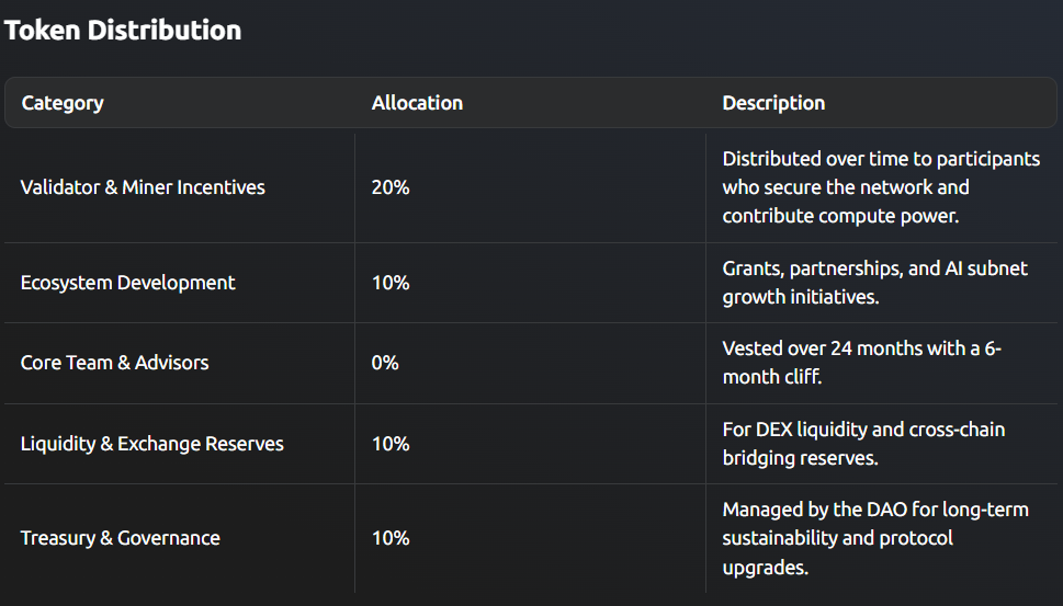 $TORA token’ı sistemi yönlendirir. Gas ücretleri, validator payları, madenci teşvikleri ve alt ağ oluşturmayı destekler. Böylece Tensora’nın zincir içi zeka ekonomisinin temelini oluşturur.