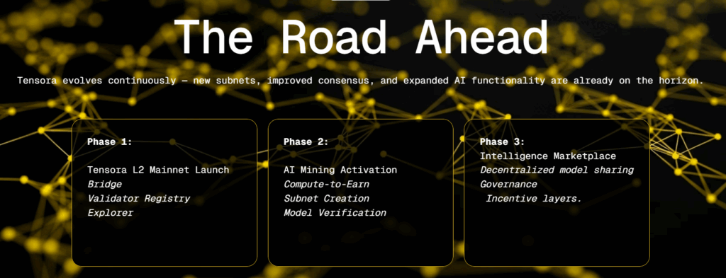 - Aşama 1: Tensora L2 Ana Ağının Başlatılması, Köprü (Bridge), Doğrulayıcı Kaydı (Validator Registry), Gezgin (Explorer).