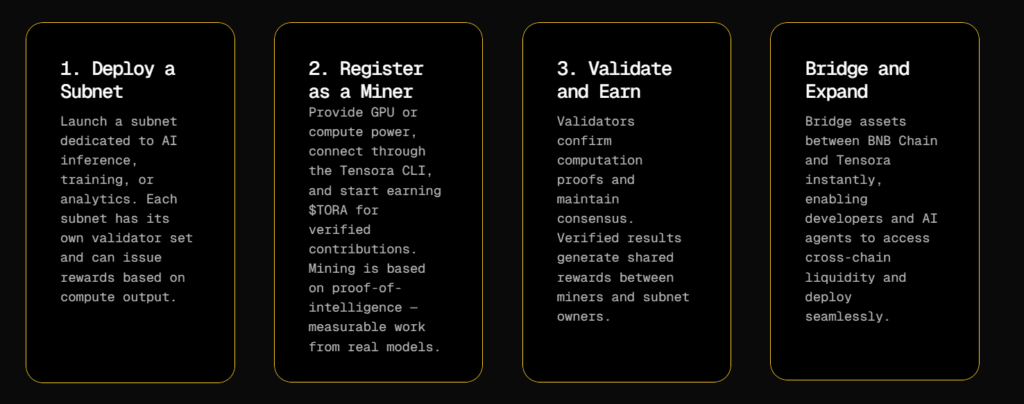 - Madenciler (Miner): Hesaplama gücü sağlayarak ve AI çıkarımı yaparak $TORA kazanırlar.