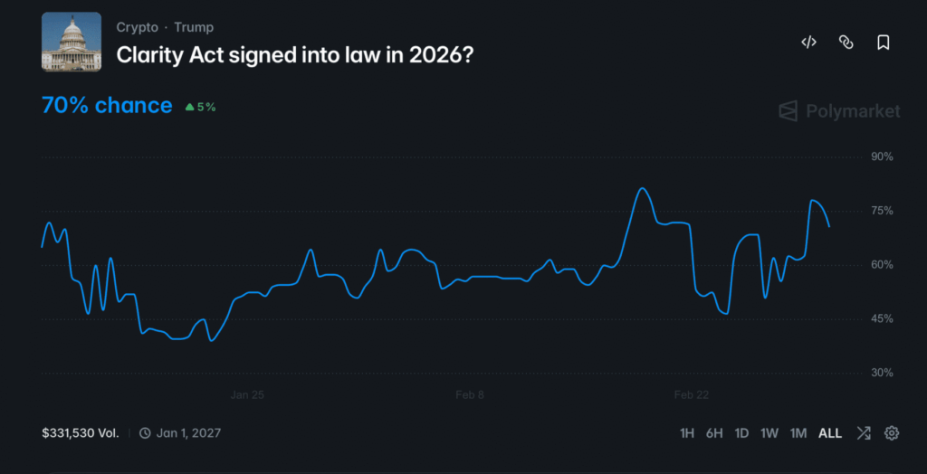 Buna rağmen piyasa beklentisi son günlerde yeniden yükseldi. Tahmin platformu Polymarket verilerine göre, Trump’ın açıklamalarının ardından yasanın 2026 içinde kabul edilme olasılığı %70 seviyesine çıktı.