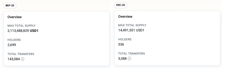 USD1’in arzının büyük çoğunluğu Binance destekli BNB Chain üzerinden sağlanıyor. BscScan verilerine göre dolaşımdaki tüm arzın %99’undan fazlası (2,1 milyar $) BEP-20 formatında. Ethereum tabanlı ERC-20 versiyonu ise yalnızca 14,5 milyon $ değerinde ve çok daha sınırlı bir kullanımda.