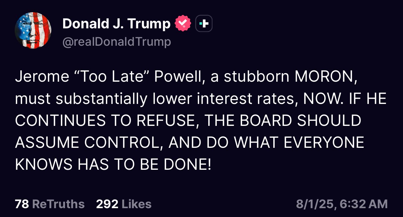 “Powell, inatçı bir aptal. Faiz oranlarını derhal ciddi şekilde düşürmelidir. Eğer bu direnci sürdürürse kurul yönetimi ele almalıdır!”