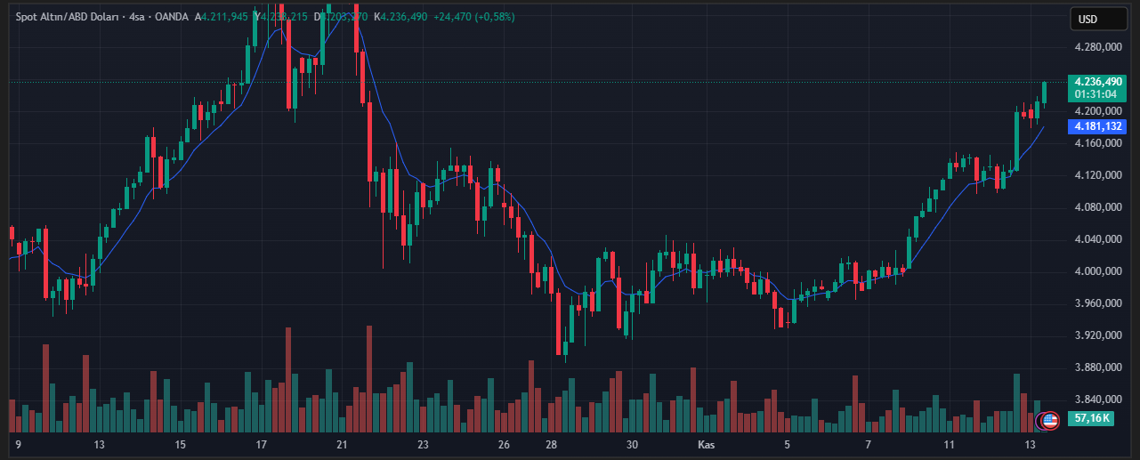 Spot altın fiyatı, ons başına 4.236,52 dolar seviyesine yükselerek 21 Ekim’den bu yana en yüksek değerine ulaştı.