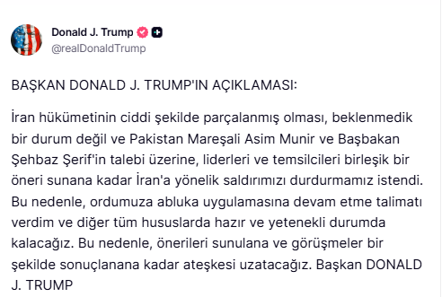Normal şartlarda ateşkesin 22 Nisan Çarşamba günü sona ermesi bekleniyordu. Trump daha önce uzatma ihtimalini düşük olarak değerlendirmişti. Ancak gün sonunda karar değişti. Açıklama Truth Social üzerinden paylaşıldı.