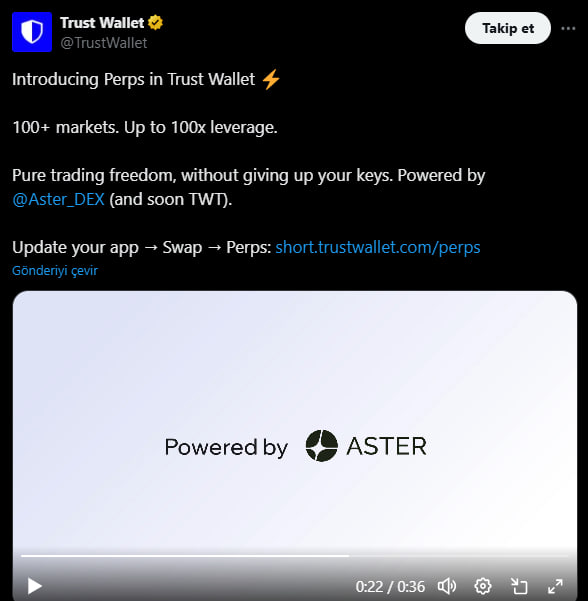 Aster DEX’in entegrasyonu, özellikle BNB Chain ekosistemi için kritik bir adım olarak değerlendiriliyor, yaklaşık 100 milyon dolarlık işlem hacmine sahip. Trust Wallet, bu hamleyle birlikte daha derin likiditeye, daha düşük işlem maliyetlerine ve sorunsuz DeFi erişimine olanak sağlıyor.