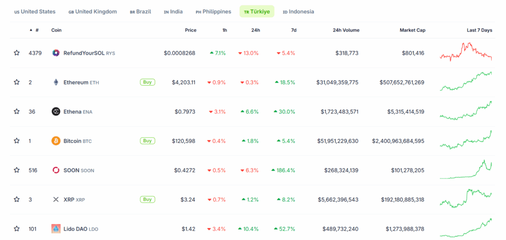CoinGecko verilerine göre, 4–10 Ağustos 2025 haftasında Türkiye’de en çok ilgi gören altcoinler belli oldu. Zirvede, düşük fiyatıyla dikkat çeken RefundYourSOL (RYS) yer aldı. Onu, piyasa değeri bakımından ikinci sırada bulunan Ethereum (ETH) takip etti. Ethena (ENA) haftayı üçüncü sırada tamamladı.