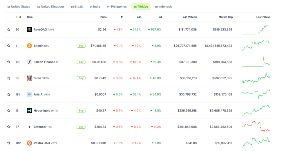 Türkiye’de kripto para tarafında tablo yine hızlı değişti. Türkiye’de en trend kripto paralar listesinde bu kez RaveDAO (RAVE) net şekilde öne çıktı. Sosyal medya akışı, arama trendleri ve işlem hacmi aynı noktada kesişmiş durumda. RAVE tarafındaki sert hareket, aslında sadece fiyat değil; ilginin nasıl bölündüğünü de gösteriyor. Bir yanda yeni projeler, diğer yanda Bitcoin ve Ethereum gibi ağır toplar piyasa aynı anda iki farklı hikaye yazıyor gibi.