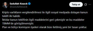 Kısacık yaptığı açıklamada, sosyal medyada dolaşan düzenlemenin ilk hazırlanan taslak metin olduğunu ve güncelliğini kaybettiğini vurguladı. Ayrıca iktidarın, söz konusu metinde yer alan kripto vergisine ilişkin maddeleri daha sonra geri çektiğini ifade ederek, bu düzenlemenin artık geçerli bir çalışma olmadığını belirtti.