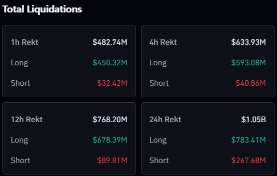Ayrıca son 24 saatte kripto para piyasalarında yüksek volatilitenin etkisiyle 1,05 milyar doların üzerinde pozisyon likide edildi. Likidasyonların 781,97 milyon dolarlık kısmı long (uzun) pozisyonlardan, 270,19 milyon dolarlık kısmı ise short (kısa) pozisyonlardan kaynaklandı. Bu gelişme, yatırımcıların kaldıraçlı işlemlerde ciddi kayıplar yaşadığını ve piyasa hareketlerinin her iki yönde de sert olduğunu ortaya koyuyor.