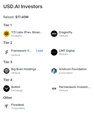 USD.AI bugüne kadar toplam 17,40 milyon dolar yatırım almıştır. Protokol; hem kripto yerel fonlardan hem de kurumsal yatırımcılardan destek görmektedir.
