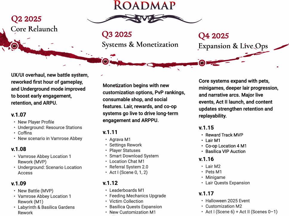 2025’te odak tamamen ekonomiyi çalıştırmaya kayıyor. Play-to-Earn mekanizması devreye giriyor, oyun içi marketplace açılıyor ve VON staking başlıyor. Yılın ikinci yarısında ise Underground modları, evcil hayvan sistemi ve klan savaşlarıyla oynanış derinleştiriliyor.